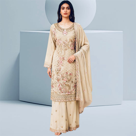 Three-piece Asian Chiffon Suit with Palazzo Trousers Elegant Stone & Embroidery Work for Comfort & Style Long Sleeves