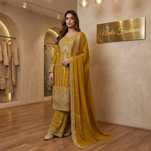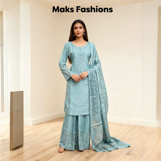 Ready Made Embroidered Sequins suit with Palazzo Trousers & Chiffon Dupatta